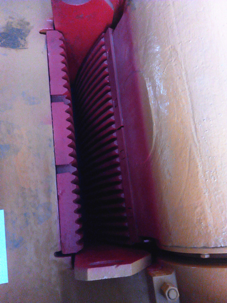 顎式破碎機(jī)的工作部分是兩塊顎板,一是固定顎板(定顎),垂直(或上端略外傾)固定在機(jī)體前壁上,另一是活動顎板(動顎),位置傾斜,與固定顎板形成上大下小的破碎腔(工作腔)。活動顎板對著固定顎板做周期性的往復(fù)運(yùn)動,時而分開,時而靠近。分開時,物料進(jìn)入破碎腔,成品從下部卸出;靠近時,使裝在兩塊顎板之間的物料受到擠壓,彎折和劈裂作用而破碎。